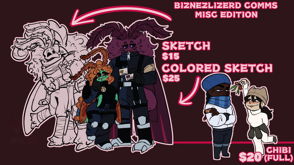 ✦ Must pay through preferably Kofi in USD ✦✦ Alternative payments include paypal ✦✦ Pay half upfront, and other half for full total after sketch is complete ✦✦ No refunds once payments are made ✦✦ You can ask for updates weekly on progress on the work or position in queue ✦✦ Be clear on what you want commissioned. You can provide references via photos, drawings or other images if descriptions are difficult ✦✦ Max amount of revisions allowed during sketch or linework phase are 5 ✦✦ Do not use my work for commercial uses without prior consent ✦✦ Do not claim my art as your own ✦✦ Using my art to train any AI generation model is strictly prohibited and will result in you becoming blacklisted ✦